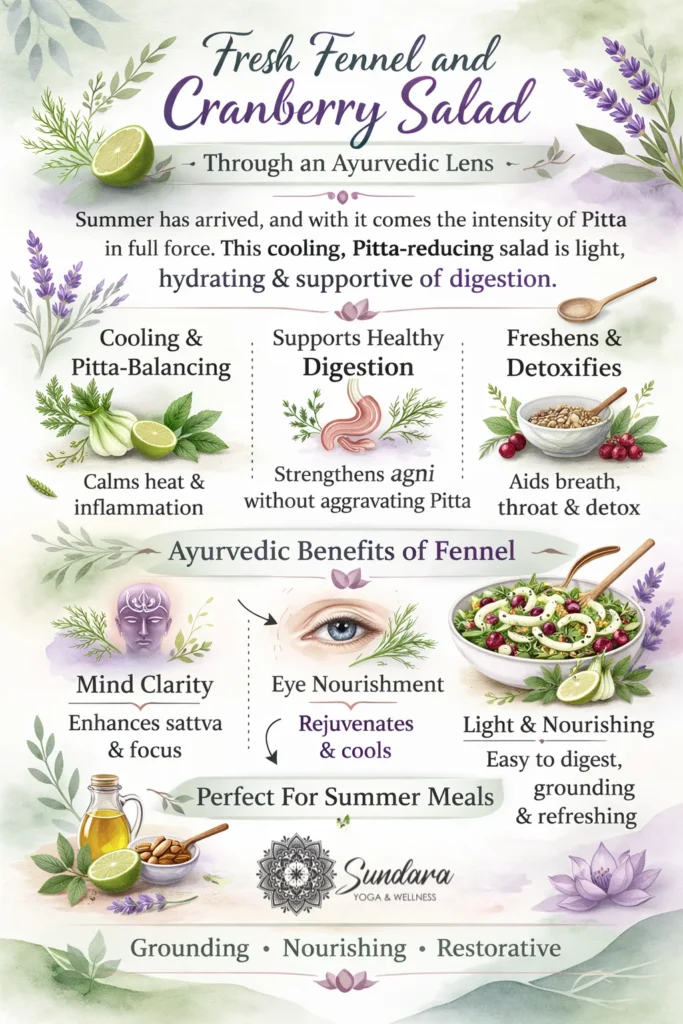 Summer has arrived, and with it comes the intensity of Pitta in full force. As temperatures rise, the body naturally seeks cooling, calming nourishment to restore balance. This refreshing, Pitta-reducing salad is the perfect companion to your main midday meal , light, hydrating, and gently supportive of digestion.