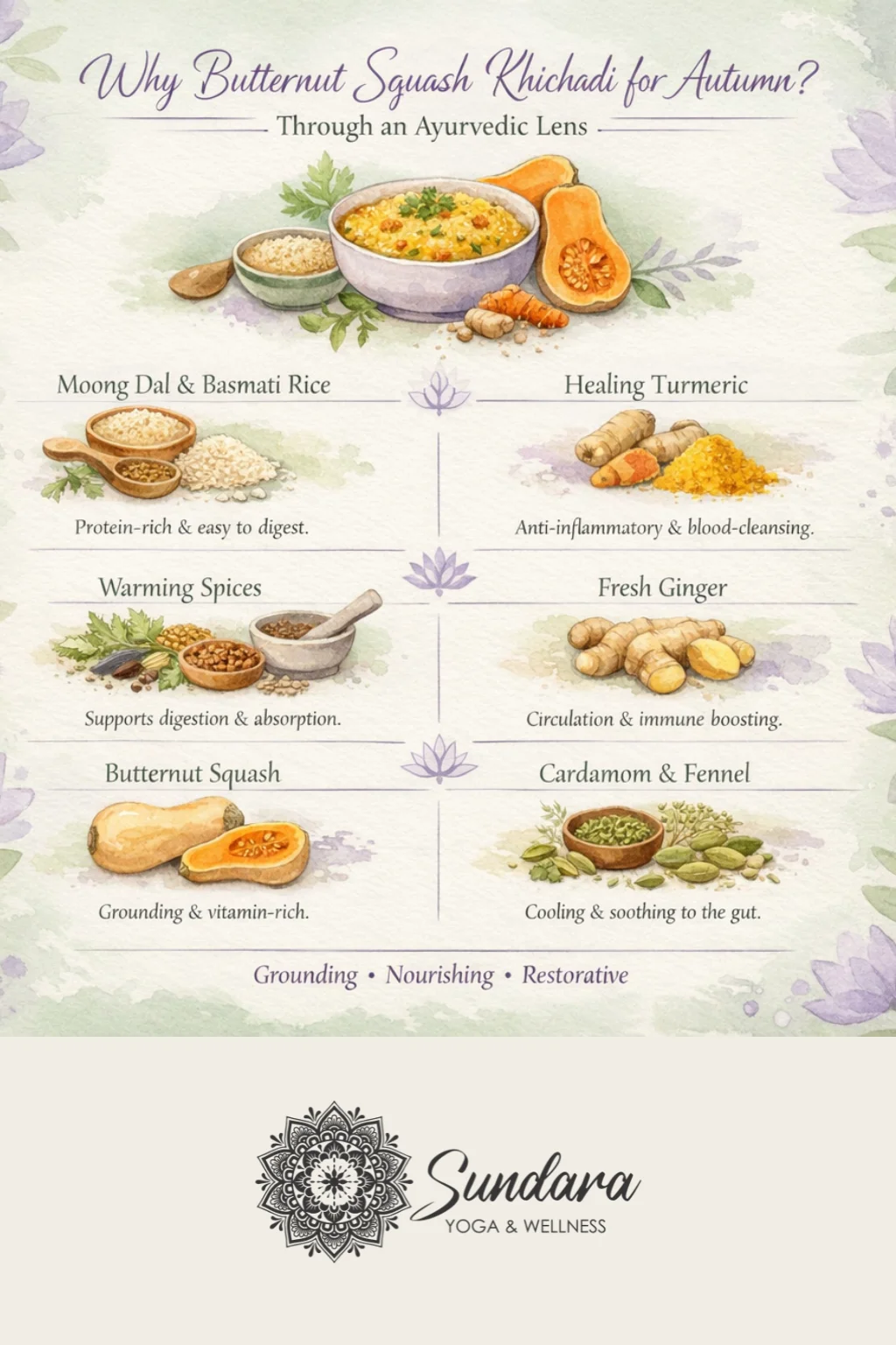 This butternut squash khichadi is a beautiful expression of food as medicine. Combining soft basmati rice, protein-rich moong dal, warming digestive spices, and the natural sweetness of butternut squash, it offers a deeply nourishing, easy-to-digest meal that supports both body and mind. Designed to calm Vata, soothe residual Pitta, and rekindle digestive fire, this recipe is ideal for seasonal transitions, gentle cleanses, or whenever you need a comforting reset.